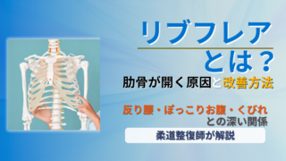 リブフレアとは肋骨の下が前に開いた状態のこと。セルフチェック方法や原因(反り腰・姿勢不良・呼吸の浅さ)、くびれや腹圧との関係、改善ストレッチや体幹トレーニングまで柔道整復師がわかりやすく解説します。